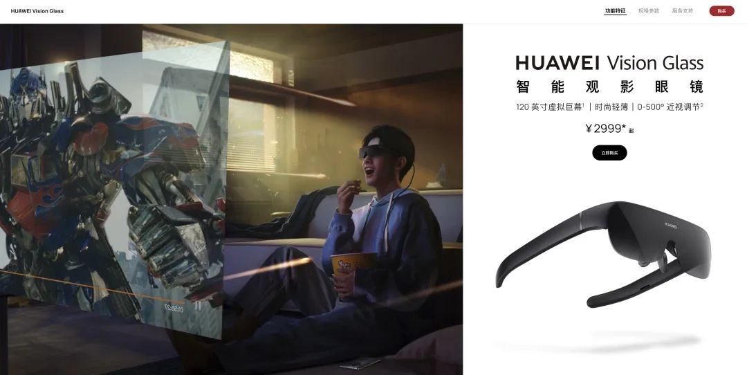 比如 Vision Glass 明明是個 AR 眼鏡,但宣傳頁面當中卻沒有出現過一次 “AR” 這個詞,華為對它的介紹是:這就是一個擁有 120 英寸虛擬巨幕的智能觀影眼鏡。