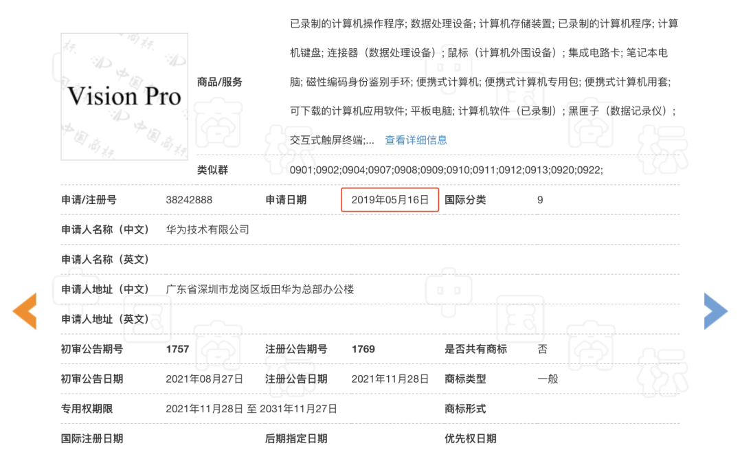 一個最典的例子,就是華為在 2019 年的時候註冊了 “Vision Pro” 這個商標,這可比蘋果發佈 Vision Pro 早了 4 年。