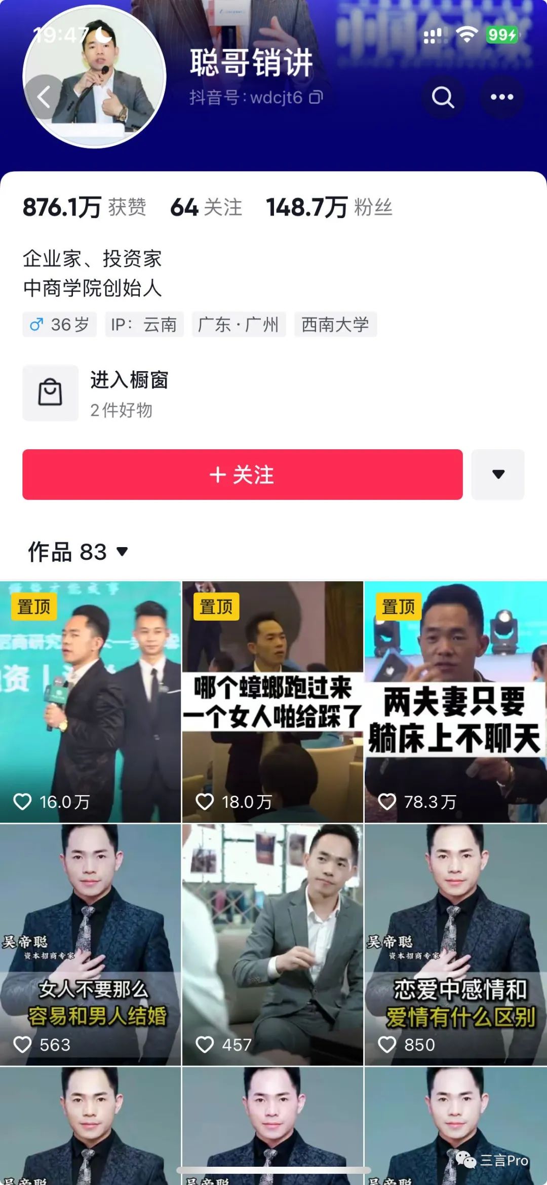 吳帝聰被稱為成功學中的“東邪”,其相關短視頻賬號粉絲量也在百萬之上。視頻內容則多以夫妻關係、企業運營和銷售模式為主。