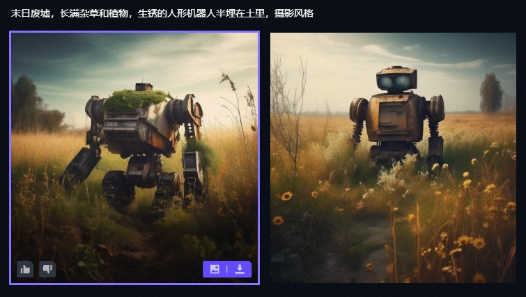 “ 末日廢墟,長滿雜草和植物,生鏽的人形機器人半埋在土裏,寫實風格。”