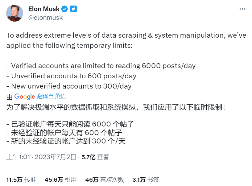 結果上週,馬斯克作了一下妖,限制了所有用户的瀏覽數量。