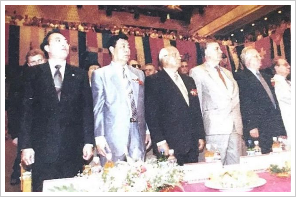 一張身着中山裝的大幅肖像,掛在集團大樓最顯眼的地方;喜歡站在一張世界地圖上和來訪者握手,身後掛着另一張世界地圖……