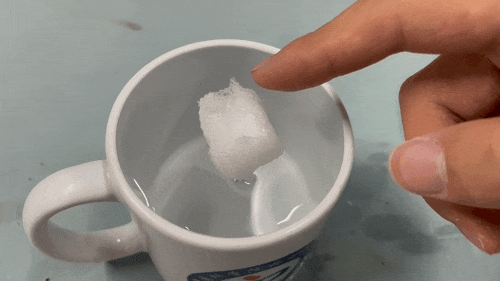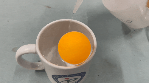 而當我們將水緩慢加滿後,同樣因為表面張力的原因,水能高出杯口,形成一個上凸的液麪。這時浮在水面上的乒乓球會受到剛剛相反的力,從而能回到杯子的中央。