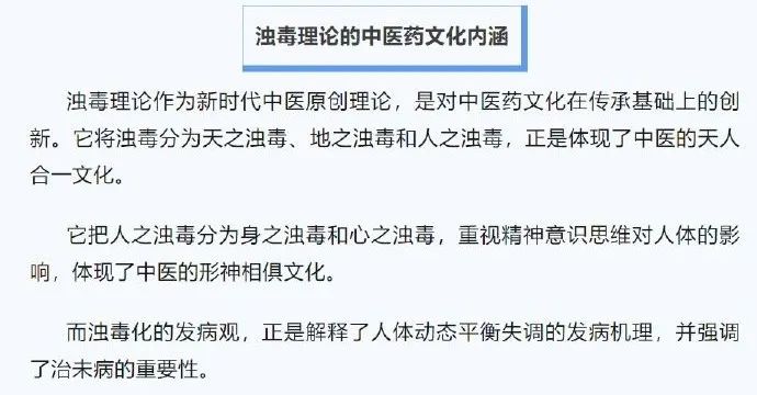 濁毒理論作為新時代中醫原創理論,是對中醫藥文化在傳承基礎上的創新。它將濁毒分為天之濁毒、地之濁毒和人之濁毒,正是體現了中醫的天人合一文化……