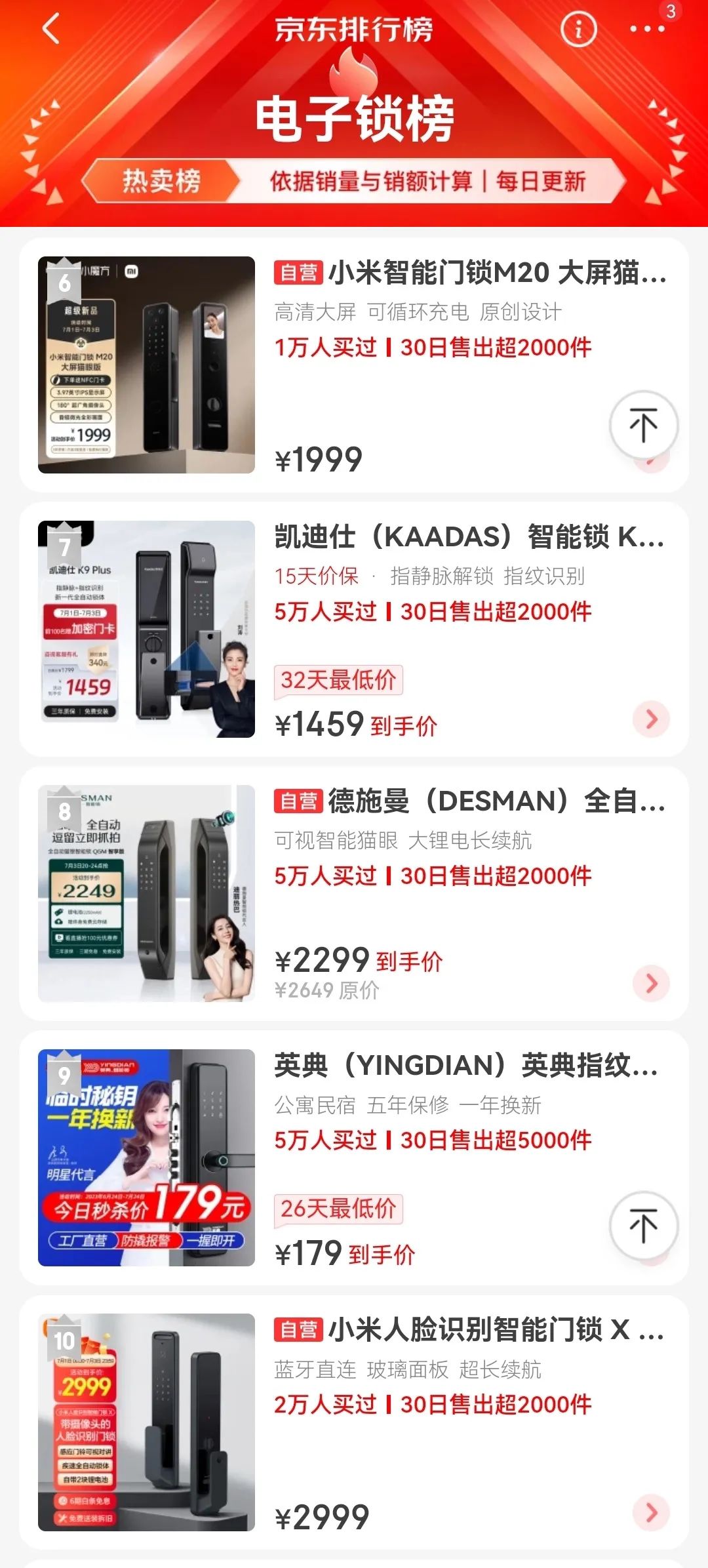 再看銷售榜單,以京東電子鎖榜為例,TOP 1是價格為799元的小米智能鎖,排名前七的智能鎖售價均在2000元以下,佔據榜單前四位是小米的4款智能鎖,TOP 8是德施曼的一款活動到手價為2299元的中端智能鎖。