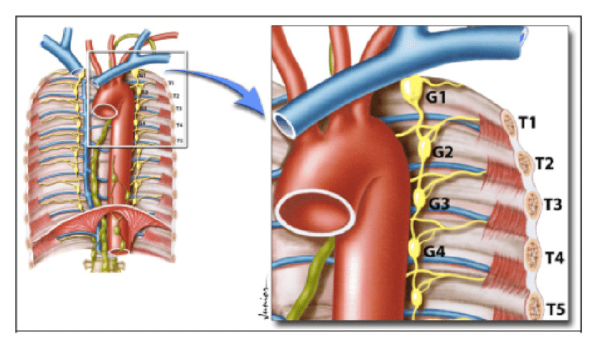 交感神經節的位置示意圖,其中字母G代表交感神經節,T代表肋骨(圖片來源:Nelson Wolosker, 2020)