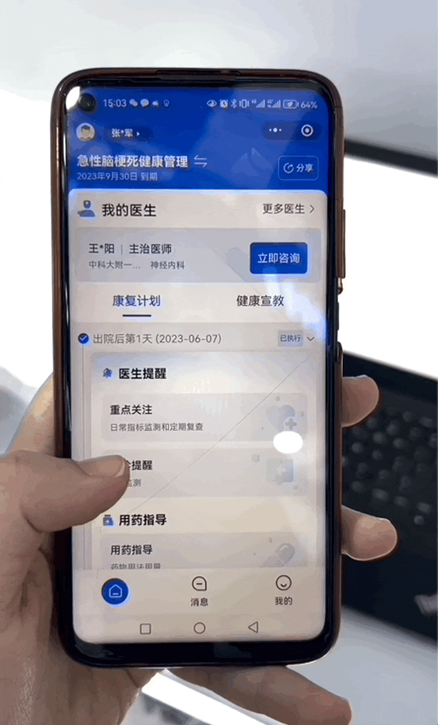 主要是輔助醫療場景,以診後管理為例,在患者走出醫院那刻開始,大模型就將根據患者信息生成為其90天的康復計劃。包括醫生提醒、用藥指導、康復運動、健康知識、健康檔案等,並且可以隨時與主治醫生交流。