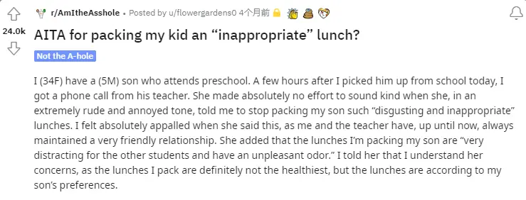 不久前,一位韓國媽媽在Reddit論壇上分享,自己給上日託班的5歲兒子精心準備的韓式午餐,卻被老師説“噁心、不合適、有難聞的氣味”。