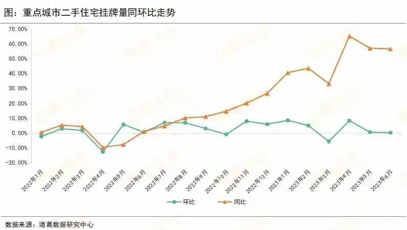 根據諸葛數據研究中心的監測,眼下國內房地產市場正迎來史上最大的拋售潮。2023年6月,10個重點城市二手房掛牌量達到158萬套,同比上漲57%。蘇州拋售量最為洶湧,掛牌數量超過20萬套,同比漲幅超過140%。成都、重慶的拋售量也都在20萬套以上,深圳、南京、杭州則在10萬套以上。