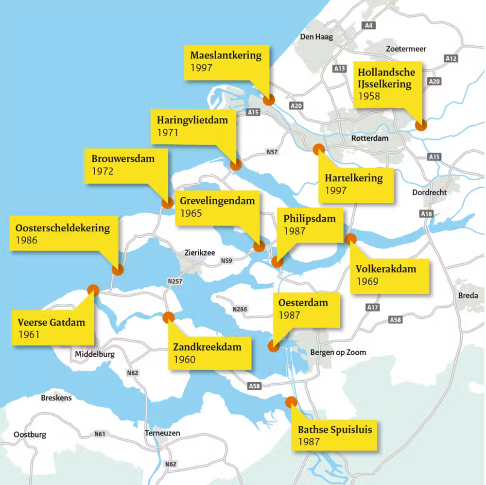 1953年春季,荷蘭發生了風暴潮,北海海水形成一堵高達7.5米的水牆,襲擊了荷蘭。這場災害奪去了1836條生命;約10萬人失去家園;47300座建築物遭到破壞;20萬公頃的土地被淹沒。荷蘭政府開始認真思考如何永遠杜絕水患,災後17天成立了特別委員會,任務是「制定措施,以使這樣的災難可能不會再發生」。