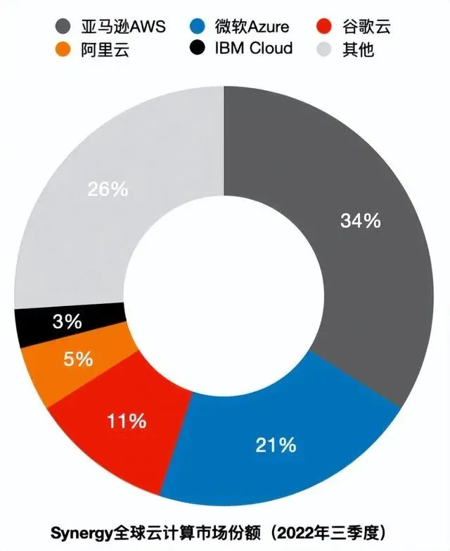市場調研機構Synergy Research數據顯示,2022年三季度全球雲計算基礎設施(公有云IaaS+PaaS以及託管私有云)市場前四強分別是:亞馬遜AWS(34%)、微軟Azure(21%)、谷歌雲(11%)、阿里雲(5%)。作為行業老大的亞馬遜雲,依然要比微軟雲與谷歌雲份額之和還要大。