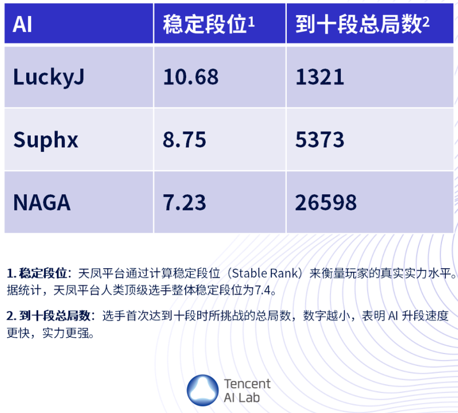 另外,相比之下,位居第二的AI Suphx訓練到十段的總局數為5373,被絕藝LuckyJ遠遠甩開,而排名第三的NAGA更是需要26598局。