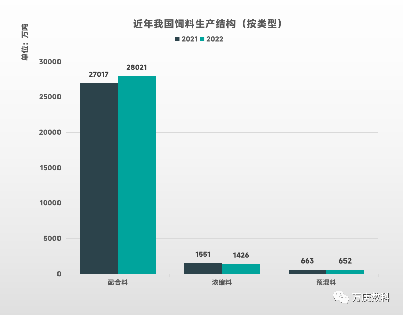 從飼料類型來看,我國絕大多數生產產能集中於配合飼料,2022年產量達28021萬噸,佔飼料整體產量近93%;濃縮飼料和預混飼料的產量較少,2022年分別為1426萬噸和652萬噸。此外,結合2021年數據,僅配合飼料在2022年有小幅增長,而後兩者產量基本無變化,配合飼料仍是未來市場主流產品。