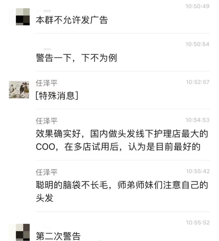 但在如今,任澤平自己也開始為生計發愁,從付費社羣到生髮劑再到白酒,只要覺得能賣的貨,任澤平一定不會放過。只不過遺憾的是,這位網紅經濟學家,居然因為在校友羣裏推銷生髮劑,被羣管理員黃牌警告。