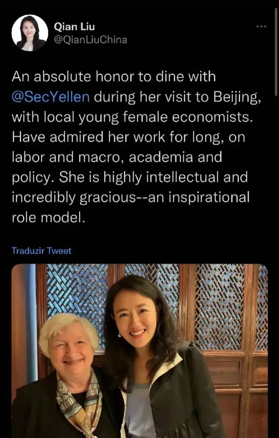 “非常榮幸在耶倫訪問北京期間與她一起用餐,並與當地年輕的女性經濟學家一起用餐。”