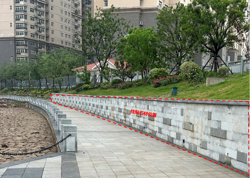 那個貼大理石的工藝,也不是所謂的“幹掛”,更不是“大理石”,所用石材為花崗岩,採用的是“先掛石材、後灌漿”的掛貼施工工藝,而非一般建築立面採用的“幹掛石材”施工工藝,具有較好耐久性、安全性。“經計算,金水河若遇100年一遇洪水,其洪水流速在2—3米每秒,掛貼花崗岩立面可抵抗該流速的沖刷”。