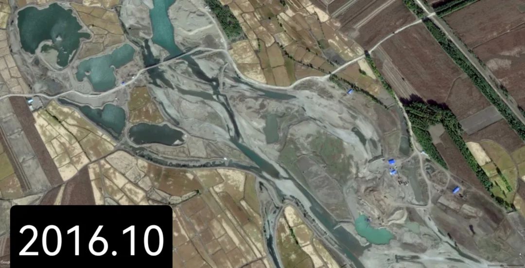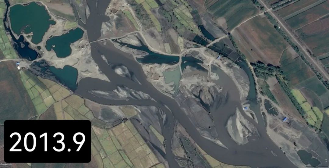 從衞星地圖上,我們還可以看到從2014年到2018年洮兒河造浮橋的那段河道被非法挖砂之後的對比。你可以輕易看出,這條河的河道在長期挖沙作業下發生的變化。
