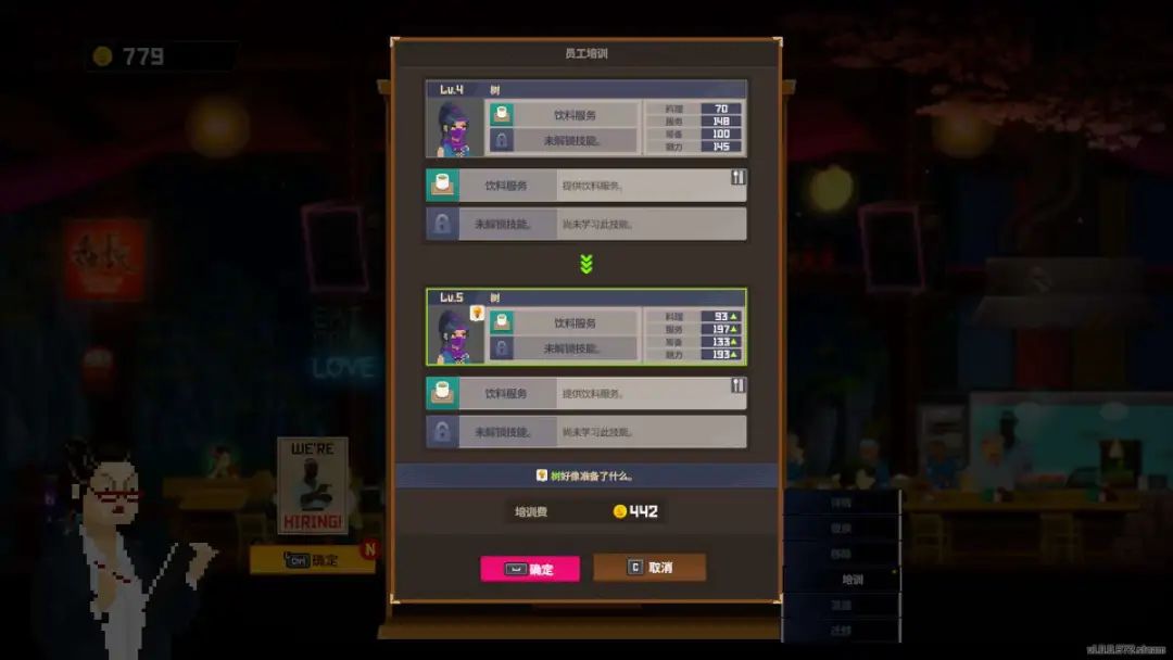 既然知道了模擬經營部分的用意,那麼圍繞這部分的成長向內容便呼之欲出了,招攬員工、提升店鋪的評級(COOKSTA)、新菜品的研發、菜品的升級等成長內容毫無意外的均是朝向提高玩家收益的方向發展。