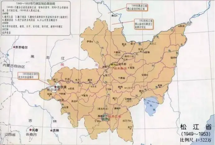 1954年,東北地區的行政建制終於調整到位,只保留黑龍江、吉林、遼寧三省,松江省併入新的黑龍江省。哈爾濱、長春、瀋陽不再是中央直轄市,變成三省的省會。