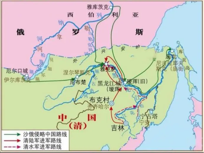 1840年鴉片戰爭的慘敗,使雅克薩之戰對沙俄的威懾作用徹底失效。沙俄軍隊越過《尼布楚條約》規定的兩國邊界,向黑龍江流域滲透。1856年第二次鴉片戰爭打響,沙俄終於露出了猙獰的真面目。