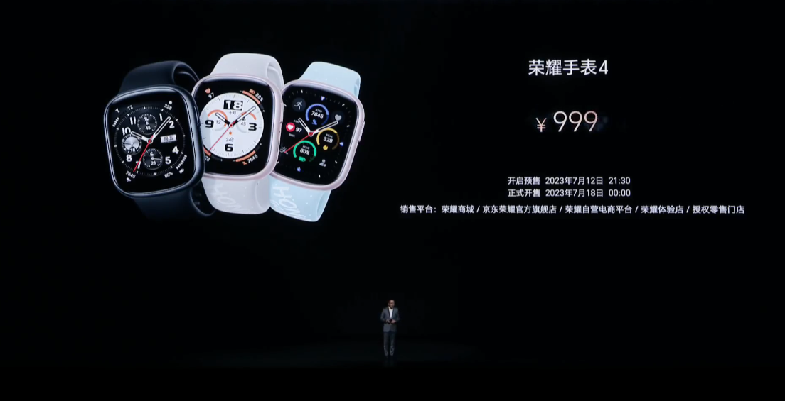 榮耀手錶4採用1.75英寸AMOLED方形屏幕採用圓形邊角設計,視覺效果圓潤流暢;中框採用鋁合金打造,搭配清爽透氣的硅膠錶帶,提供曜石黑、晨輝金、雲水藍三款配色;首發即提供400種以上個性鮮明的錶盤設計,滿足用户不同的風格需求。榮耀手錶4於2023年7月12日21:30開啓預售,並將在2023年7月18日0點在榮耀商城、各大授權平台、榮耀體驗店、授權零售門店正式開售,售價999元,授權電商平台預訂立享50元優惠。