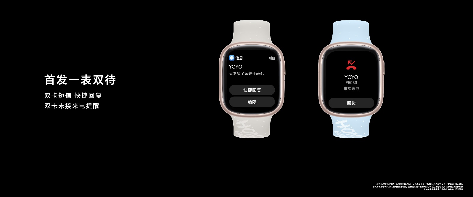 在榮耀MagicRing信任環技術的加持下,榮耀手錶4首次將信息和服務流轉從近場擴展到遠場,實現和手機的遠場自動組網,讓手機APP通知、YOYO建議可以接收,滿足用户在不同場景下的通信需求,成為您腕上的輕信息互動小助手。榮耀手錶4首發一表雙待功能,不僅可以接收手機雙卡的短信,即便手機副卡來電,也能遠程同步並可一鍵回電,是首個實現手機雙卡來電、短信都能接收的智能手錶。榮耀手錶4的“一表雙待”功能,讓智能手錶從此擁有像手機一樣“雙卡雙待”的魅力!