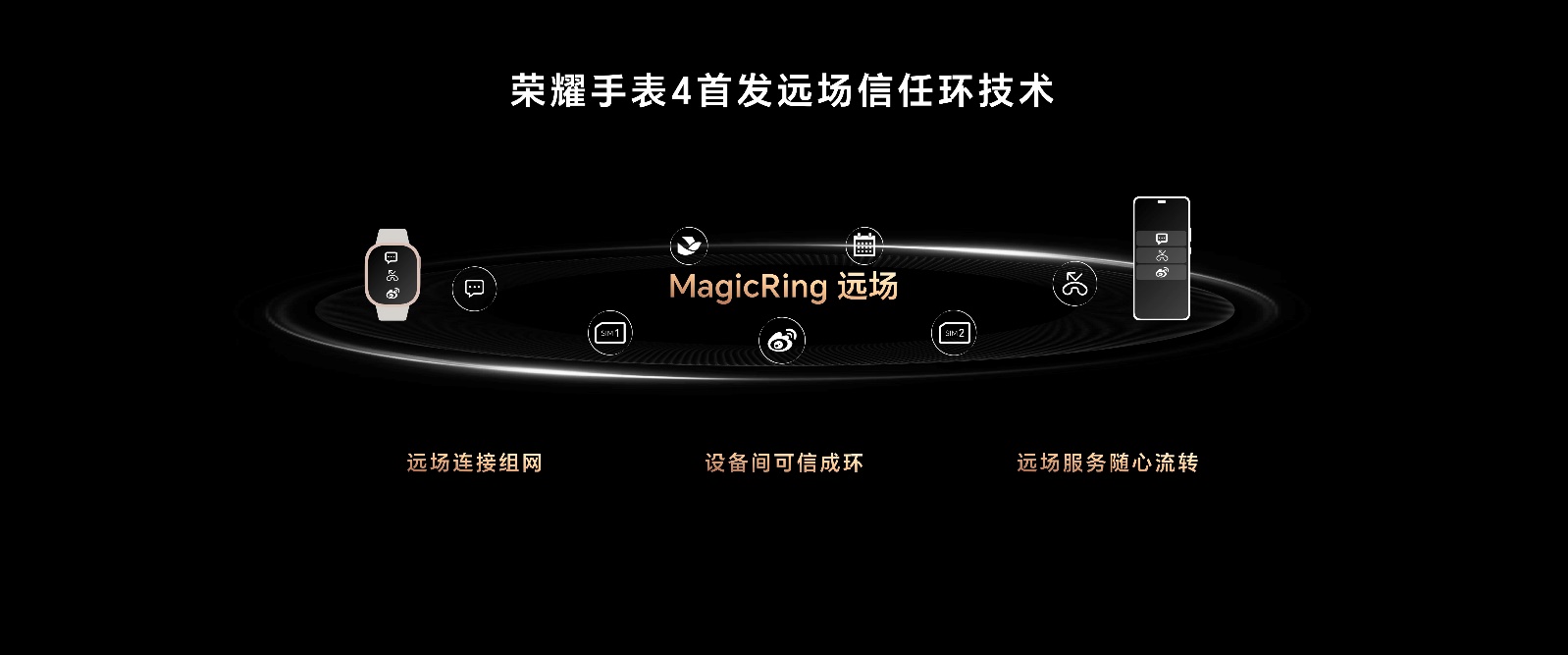 **【北京時間,2023年7月12日】**在榮耀Magic V2暨全場景新品發佈會上,榮耀正式發佈全新一代智能手錶——榮耀手錶4。榮耀首次將MagicOS引入智能手錶生態,力圖打破傳統eSIM手錶用户的信息和續航焦慮。在eSIM和MagicRing信任環的加持下,榮耀手錶4首發一表雙待功能,實現遠場消息接收;在獨創的三芯架構和OS Turbo X加持下,榮耀手錶4續航最長可達10天,遠超行業主流水平。從MagicRing遠場信任環,到OS Turbo X系統引擎,榮耀手錶4作為首個搭載MagicOS的eSIM智能手錶,為用户帶來超越預期的體驗突破,成為全面互聯、健康智慧的腕上時尚新品。