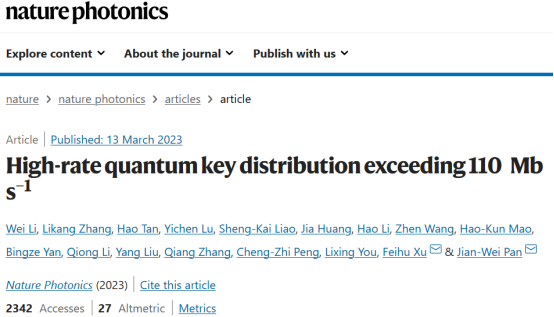 真的是這樣嗎?下面來給大家看一條新聞:依託中國科學技術大學組建的中科院量子信息與量子科技創新研究院潘建偉、徐飛虎等與上海微系統所、濟南量子技術研究院、哈爾濱工業大學等單位的科研人員合作,首次在國際上實現百兆比特率的實時量子密鑰分發,將此前的成碼率紀錄提升一個數量級(中科院量子信息與量子科技創新研究院實現百兆比特率量子密鑰分發量子科話 | 量子科話)。該成果於2023年3月14日在線發表於《自然·光子學》(https://www.nature.com/articles/s41566-023-01166-4)。