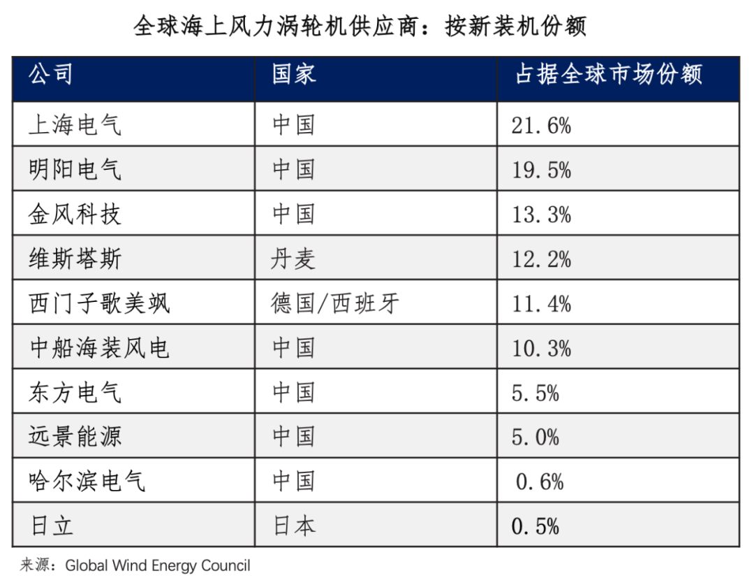 金風科技股份有限公司(金風科技)是一家風力發電機製造商。它成立於1998年,2016年憑藉直驅永磁風力發電機組獲得了製造業單項冠軍示範企業。時至今日,它已是全球第二大風力渦輪機供應商,2021年佔全球市場份額的11.8%,僅次於丹麥的維斯塔斯。金風科技也是全球第三大海上風力渦輪機供應商,2021年佔全球市場份額的13.3%,僅次於中國的上海電氣和明陽電氣。**總體而言,中國企業佔全球海上風力渦輪機市場的75%以上(按新安裝份額計算),此領域全球十大公司佔據7家。**在國內,金風科技是該領域最大的參與者,擁有中國20%的市場份額。