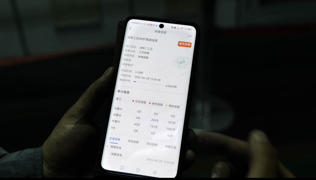 對安全隱患的處理,也在釘釘的幫助下,變得高效了很多。原來一個爐子可能要燒透了才有人知道,現在傳感器數據傳輸到平台,系統會自動建模,並計算可能出現的安全隱患,還會對問題進行分級,直接將報警或待處理問題推送到對應管理人員的手機釘釘裏,再也不用層層上報等待回覆。最高等級的報警甚至會被直接推送到董事長的手機端。