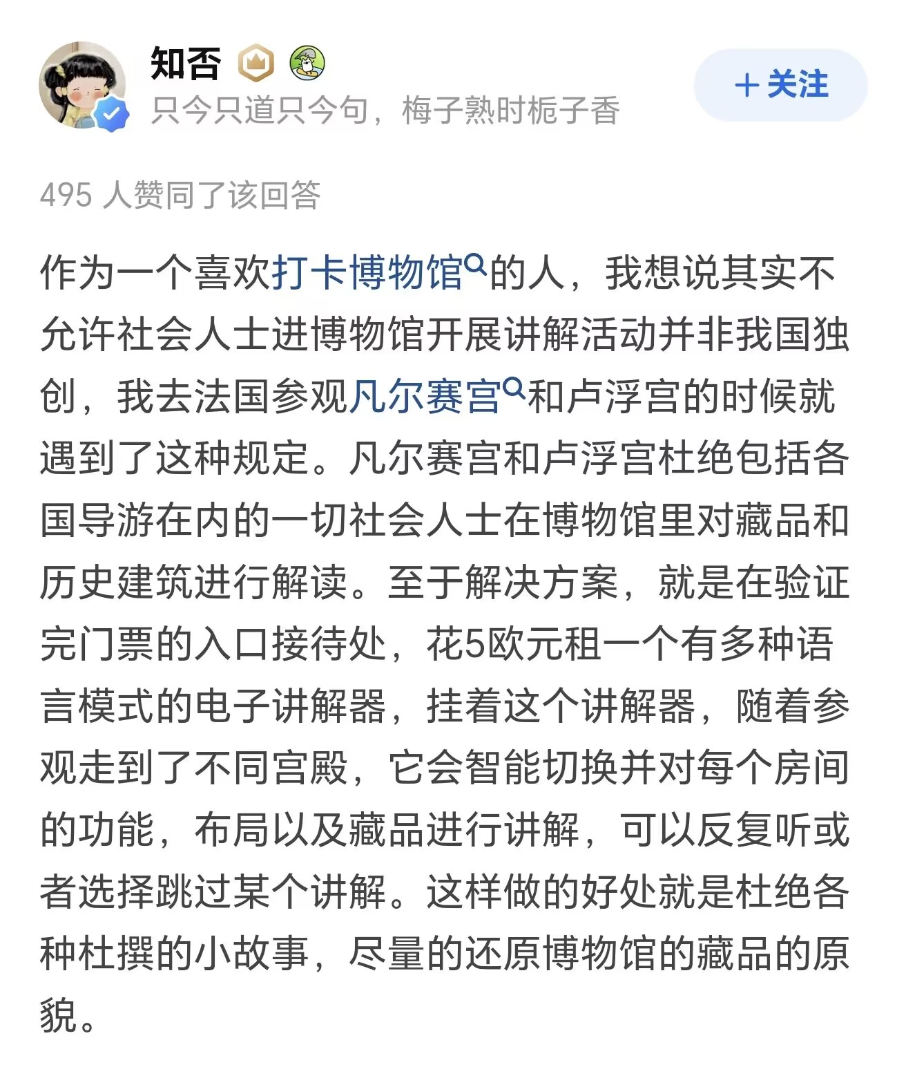 還有網友表示,類似的規定實際上在外國已經實行了很多年了,並且有的國家也給出了相對應的解決方案,比如凡爾賽宮和盧浮宮會在入口處提供多語種模式的電子講解器,帶着這個講解器,在參觀不同展品時,講解器就會自動對其進行講解。