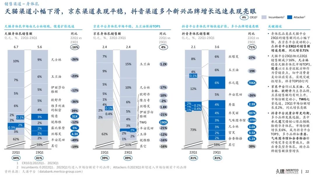 伴隨消費升級與市場教育的加強,消費者護理重點從面部聚焦到全身精緻,精細化護理趨勢助推單價提升(23Q1均價63元 vs. 22Q1均價59元 ),同時香氛類產品的熱度持續,成為提升體驗感與情緒價值的重要支點,身體乳市場逐步回暖, 23年Q1線上市場品類銷售額同比增長3%,品類在抖音平台增速亮眼,同比增長71%