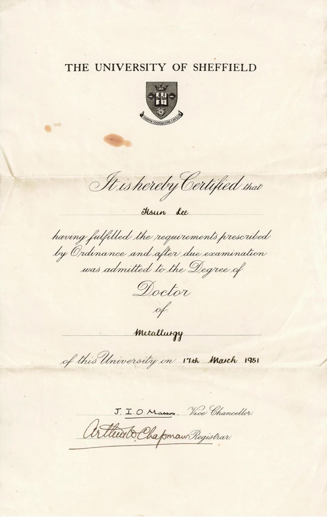1951年3月17日,謝菲爾德大學授予李薰冶金學博士學位證書。