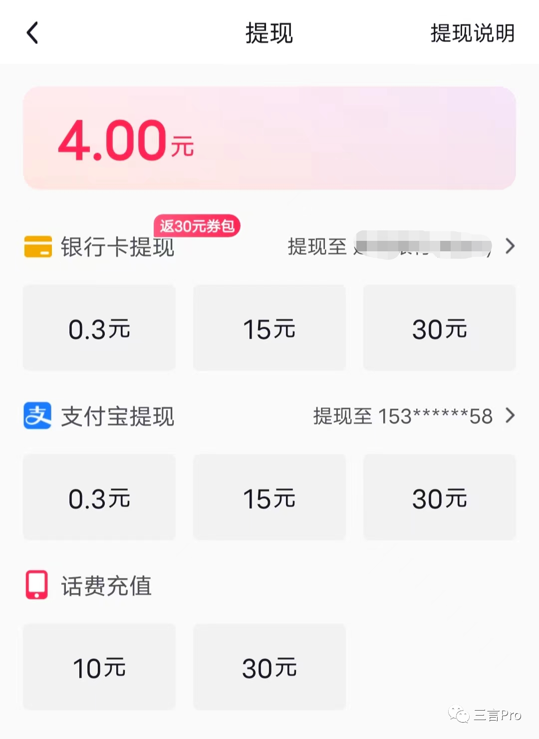 至於提現,抖音極速版可以提現到銀行卡或支付寶,金額為0.3元、15元、30元。也可以選擇充話費,金額為10元和30元。