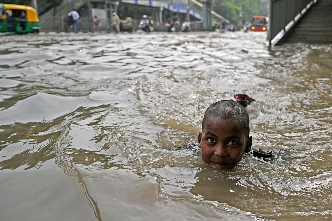 7月14日,印度新德里,一名兒童在被洪水淹沒的街道上游泳。