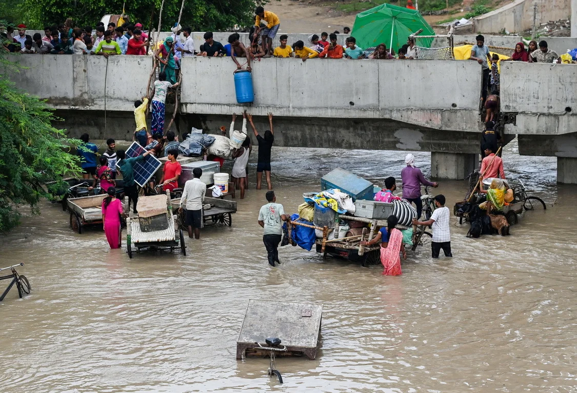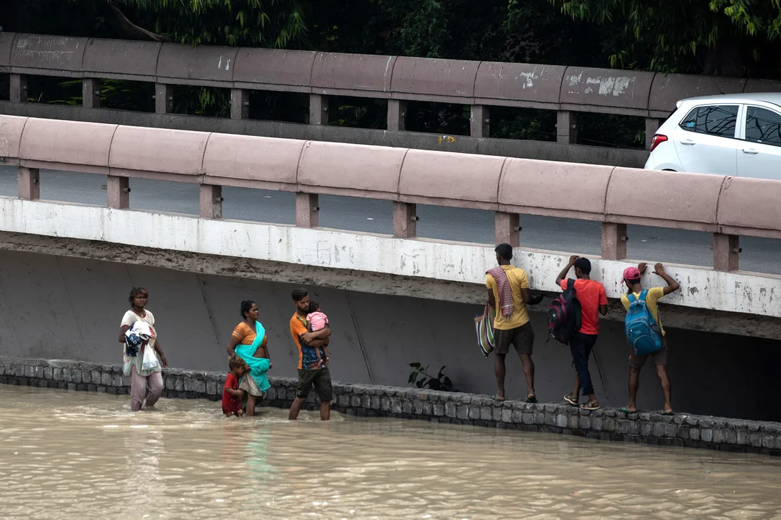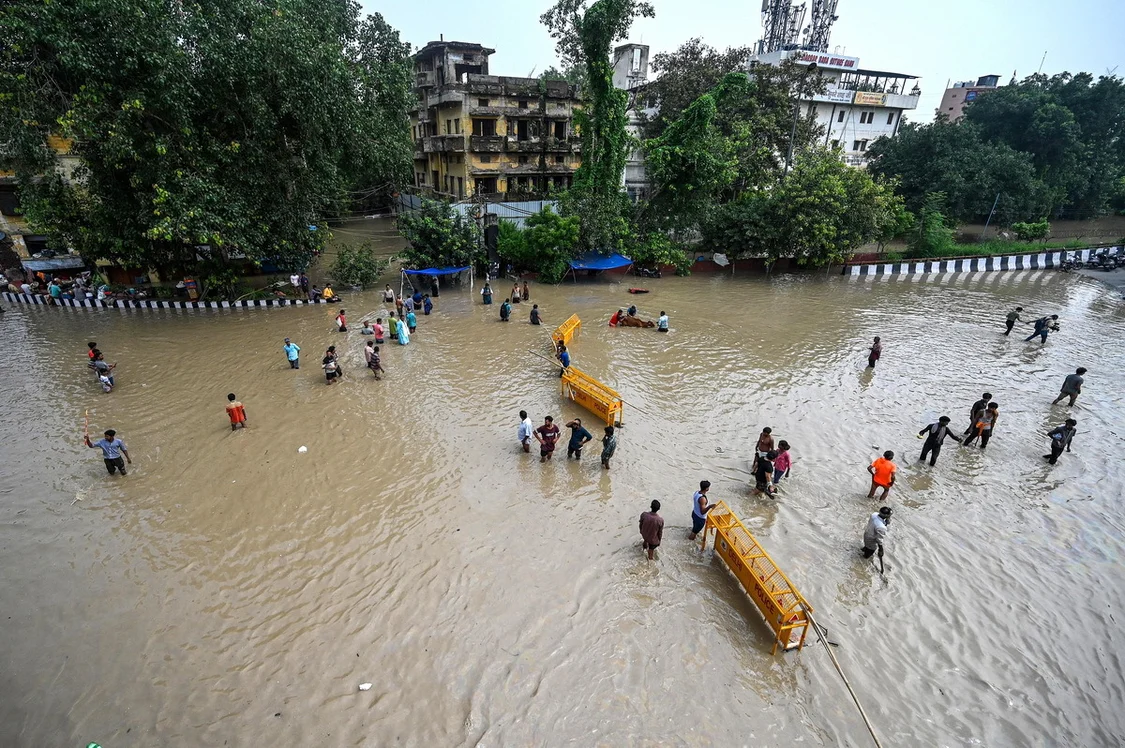 7月13號,印度新德里,人們涉水穿過被洪水淹沒的道路。