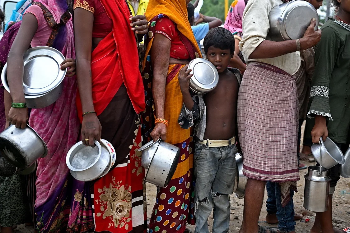 7月12日,印度新德里,一名兒童在臨時避難所排隊領取食物。