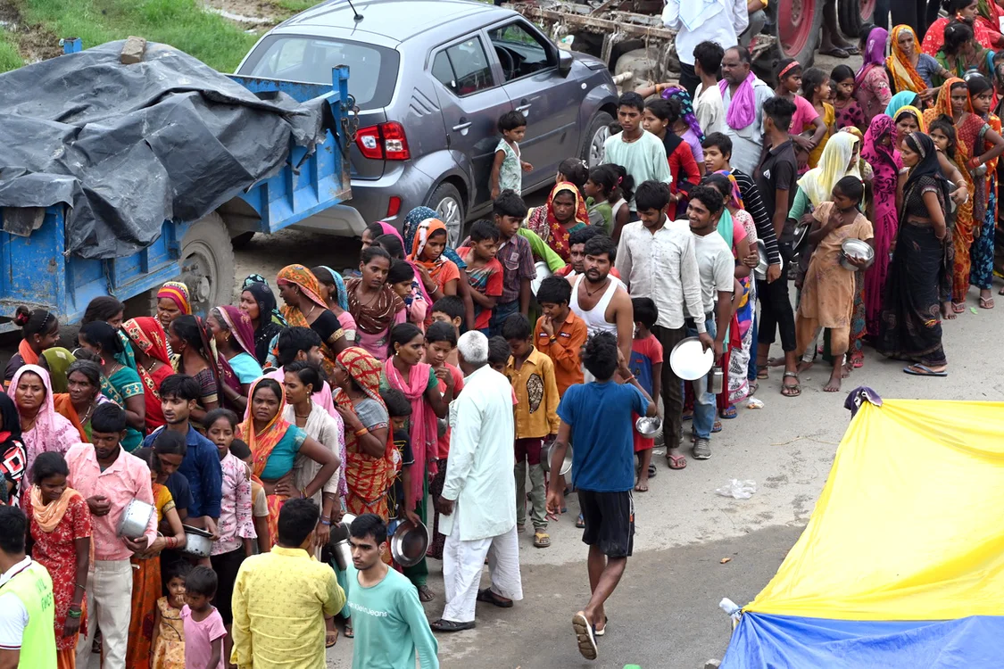 7月13日,印度,從亞穆納河低窪地區撤離的人們在新德里排隊領取免費食物。