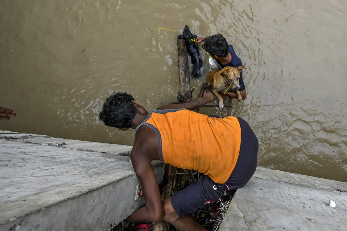 7月13日,印度新德里,當地市民帶着狗一起轉移。