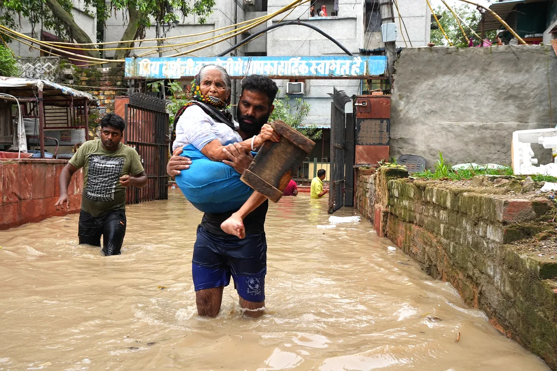 7月13日,印度新德里,一名男子正在營救一位老婦人。