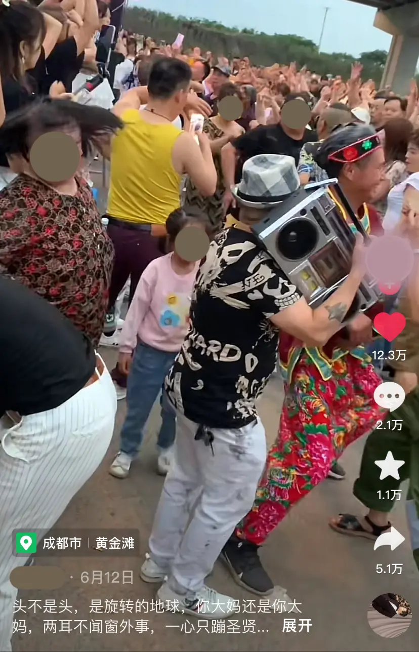 黃金灘的MC(同時也是組織者)在喊麥的過程裏時不時夾雜着一些場外,不限於:播報車牌提醒挪車,解決商販紛爭,以及提醒舞池裏年過八十的老太不要用力過猛。