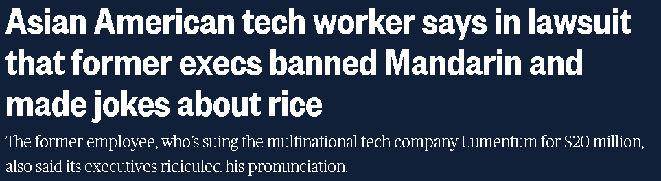 他在訴訟稱,他被解僱的直接原因是他公開談論他所經歷和觀察到的亞裔人在工作場所受到的歧視。跨國電信設備公司 Lumentum 沒有回應NBC置評請求。
