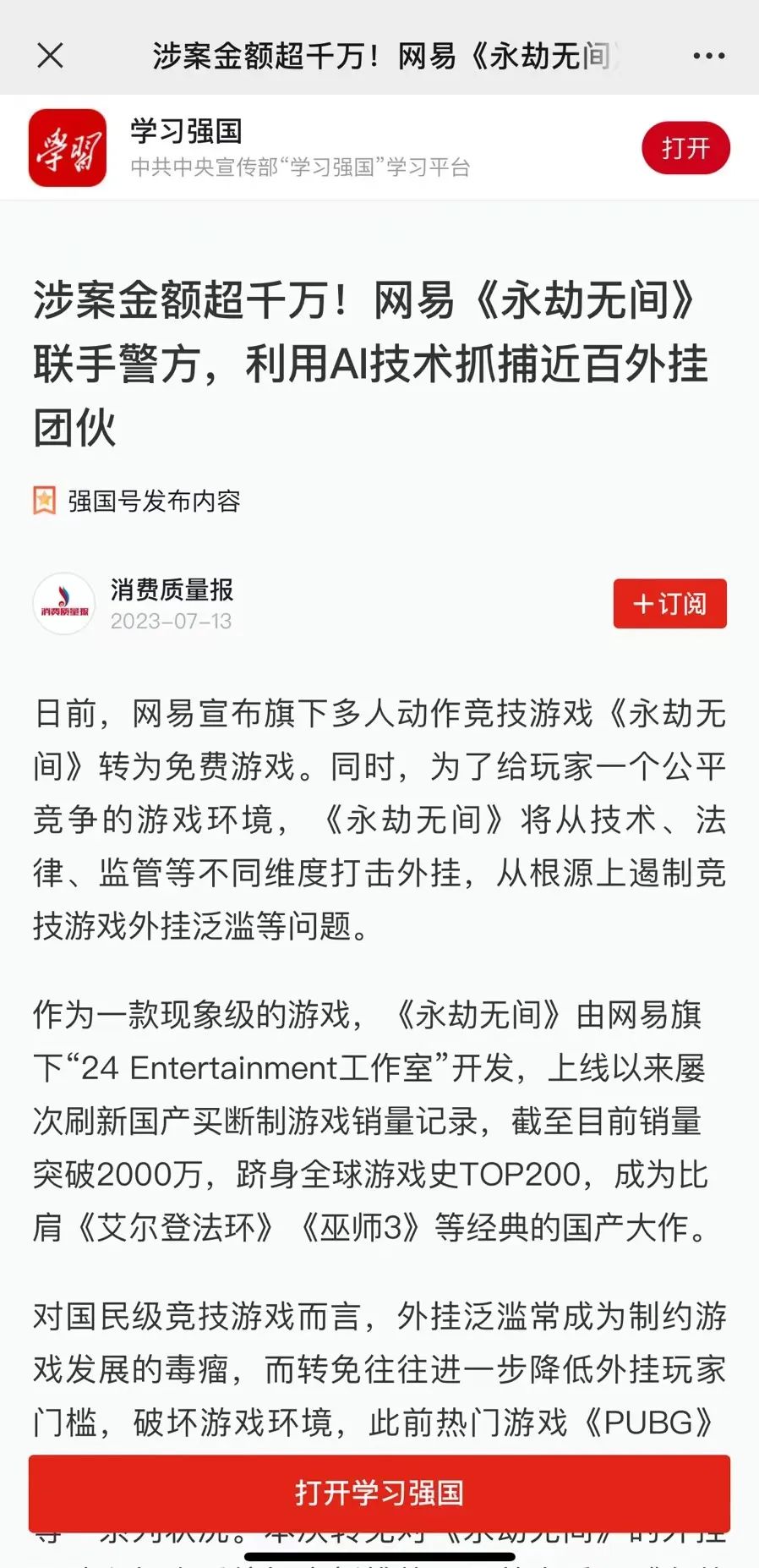 之前許多老玩家在得知遊戲免費後,經常提到的一個問題就是“開掛成本變低”,但其實無論免費與否,官方對外掛的態度一直是“零容忍”的態度。不僅成立了反外掛小組,而且聯合各地公安機關,對外掛的產業鏈進行技術分析並追查,兩年來配合警方抓捕多個外掛團伙,前幾天反外掛工作還得到了央媒的肯定: