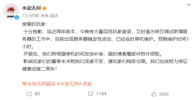 這種趨勢甚至一直延續到了遊戲正式免費後。根據官方發佈的消息,免費前一天就已經有大量玩家迴流,導致了服務器出現短暫波動: