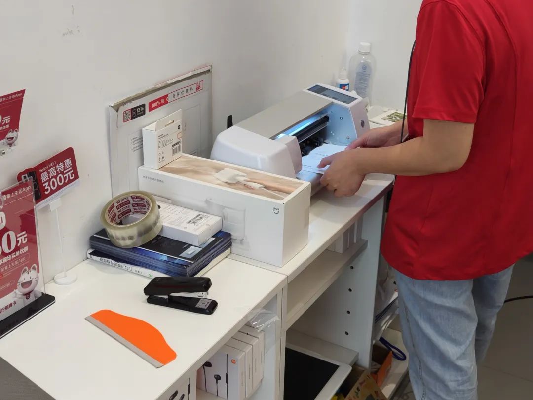 只不過我去的第一家小米專賣店,那邊店員告訴我膜已經貼完了,所以就跑去了第二家,好在那家還有,直接用裁膜機裁了張軟膜給我手機貼上。