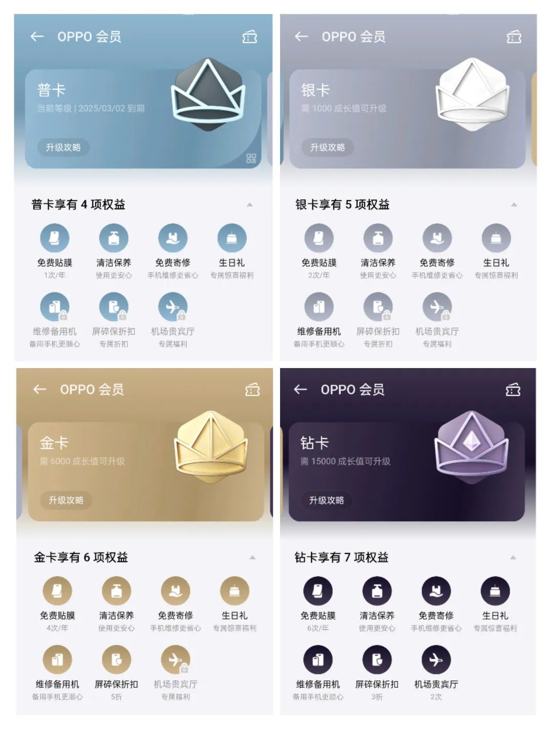 就拿 OPPO 來説,在手機設置裏點進賬號,你會發現綠廠設置了普卡、銀卡、金卡還有鑽卡這四個等級,每個等級能享受的權益有所不同: