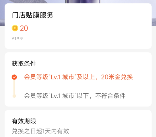 小米貼膜比較特殊,需要我們先在小米商城花 20 積分兑換它的 “ 門店貼膜服務 ”,這個服務一個月只能兑換一次,而且兑換之日起一天內有效。