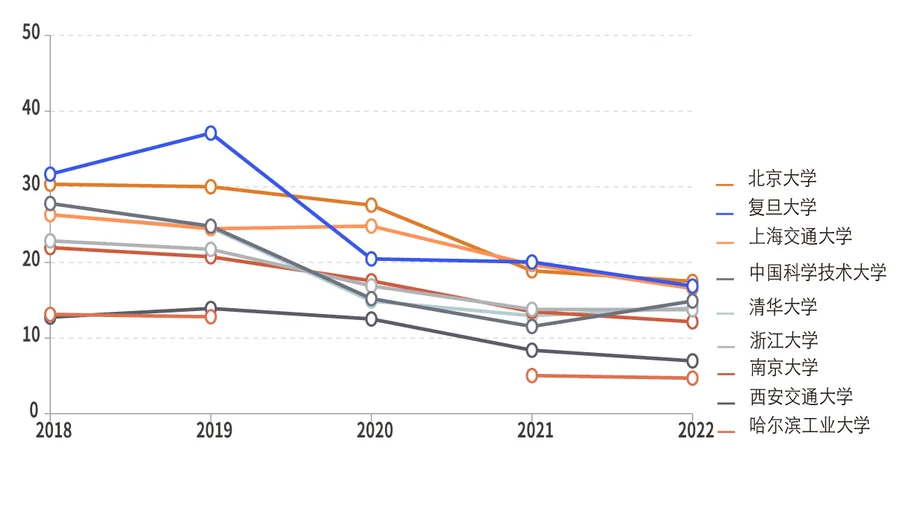 學、中國科學技術大學、哈爾濱工業大學9所高校)為例,這些頂尖高校的留學率這幾年都處於下降趨勢。C9高校的平均留學率從2018年的23.7%下降至2022年的13.1%。