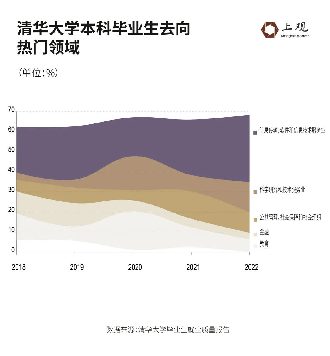 2022年的清華大學本科畢業生中,33.4%流向了信息傳輸、軟件和信息技術服務業;15.4%流向了科學研究和技術服務業;10%流向了公共管理、社會保障和社會組織。對比前幾年的數據,信息傳輸、軟件和信息技術服務業一直處於首位,教育、金融等行業也備受青睞。