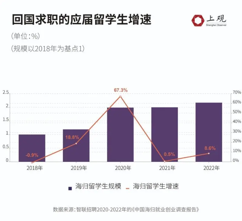 這幾年一個重要的變化是,回國求職的應屆留學生增速實現了大幅躍遷,從2018年的-0.9%,到2019年的18.8%,再到2020年的67.3%。
